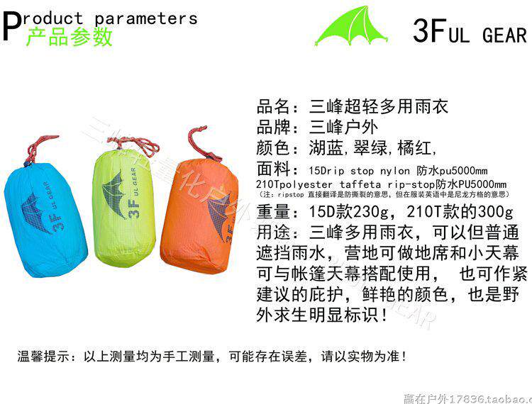 Ультра -светлый три -в одном плащном плащке, который использует 15D Ультра -светлое кремниевое покрытие водонепроницаемой нейлоновой ткань, устойчивый к износу, водонепроницаемому, ветроустойчивому, небольшому объему хранения, простое использование; различные функции, подходящие для пересечения наружного перехода, поход Приключения, выживание на поле и другие мероприятия.Бар на открытом воздухе предоставляет одну -лежащую гарантию.
