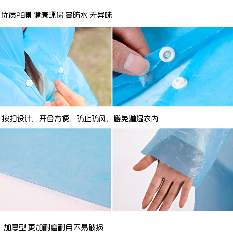 У этого продукта есть:Дождь, надежная производительность, хороша, с различными цветами. Он имеет высокую прочность, не -токсичную, без запаха, шляпы без шляп, и без тесных веревок в манжетах. Это портативный одноразовый плащ.В то же время его можно превратить в разлагаемые материалы, что действительно способствует защите окружающей среды.Его легко носить легкий вес. Это хороший партнер для отдыха и путешествий, и это также обязательно нужно для каждой семьи.