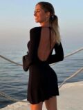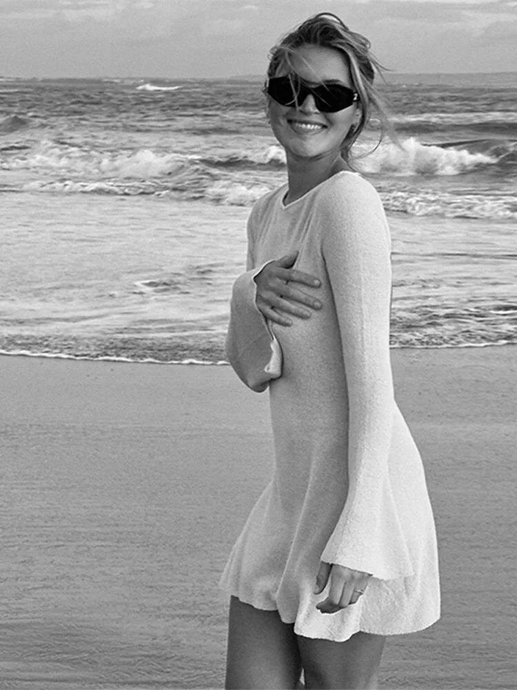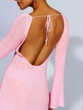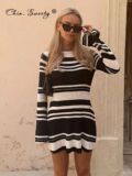 Вязаное полосатое мини -платье без спинки. Женщины Flare с длинным рукавом