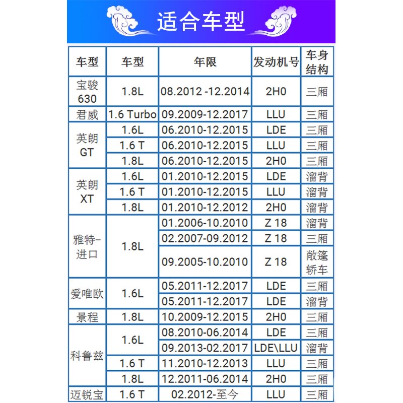 | Цвет: | Cruze 1,6 1,6t 1,8, Ингланг 1,6 1,6t 1,8, Aiweiou 1.6, Пейзаж 1.8, Mai Ruibao 1.6t, Синджунвей 1.6t, Баоджун 630 1.8 |