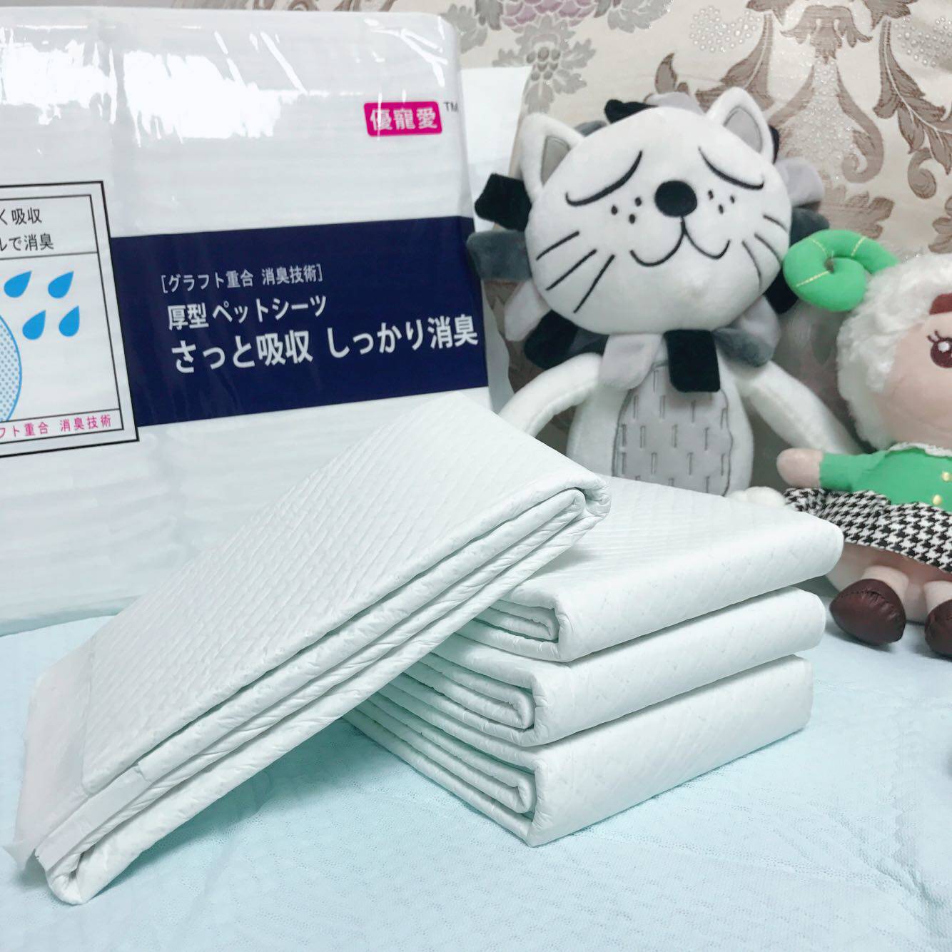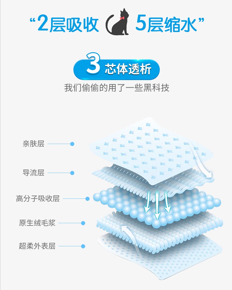 ② Импортированный полимер и импортная деревянная пульпа обеспечивает удивительную скорость поглощения воды и поглощение водного подгузника для обеспечения практичности подгузника, а среда домашних животных сухая и гигиенична!(45&Раз;Супер длинное и долговечное время!Полем
