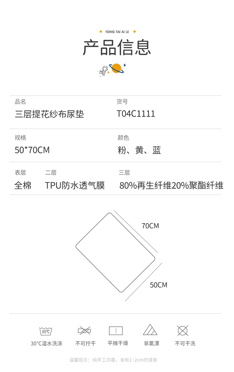 童泰 Марлевая хлопковая дышащая водонепроницаемая простыня для новорожденных для младенца для девочек, можно стирать