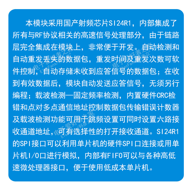 6. Низкая стоимость применения:NRF24L01 Все интегрировалоRFПротокол -связанные с высоким уровнем обработки сигналов, такие как: автоматические данные о повторении потериСумки и автоматические сигналы ответа и т. Д.SPIИнтерфейс может использовать аппаратное обеспечение однополостного микрокомпьютераSPIПодключение к порту или одно -кладовая машинаI/OСимуляция, внутриFIFOВы можете взаимодействовать с различными микропроцессорами с высокой и низкой скоростью для легкого использования одноэтажных отдельных машин.