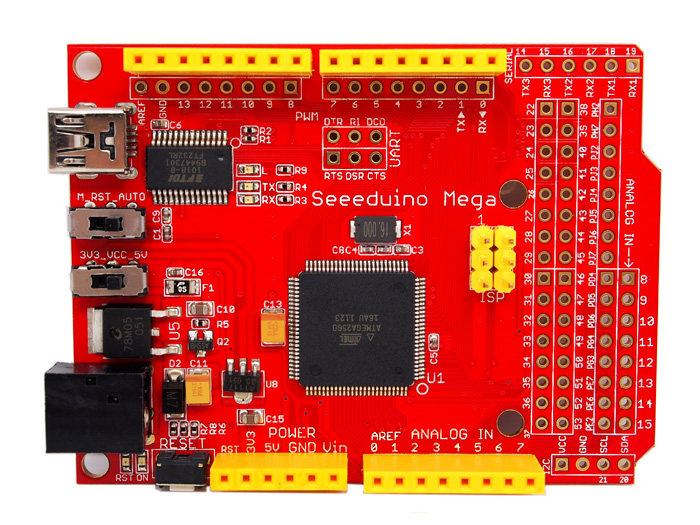 [Seeeduino Mega是一块改良于Arduino Mega的功能功能强大的主控板。它的主芯片ATmega2560令Seeeduino Mega具有高达70个数字I/O口,16个模拟输入口,14个PWM端口,和4个硬串口。与Arduino Mega相比,我们将板子的体积减少了至少30%,同时令它100%与Seeed的shields系列产品兼容。同时,Seeeduino Mega继承了Seeeduino在细节上的优良设计,如可选择的工作电压(3.3V/5V),侧拨的开关等。]