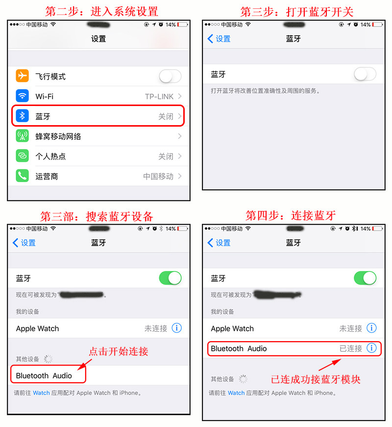“ режим Bluetooth&Rdquo ;, указывает, что модуль вошел в режим Bluetooth, включил переключатель Bluetooth мобильного телефона и искал близлежащее устройство Bluetooth на несколько секунд, чтобы увидеть имя устройства“Bluetooth Audio&Rdquo; нажмите, чтобы подключиться к мобильному телефону на мобильном телефоне после устройства Bluetooth.После того, как соединение подключено, разыгрывается доска декодирования“ успешное соединение”В настоящее время игрок телефона включен для воспроизведения музыки, а музыку на мобильной стороне можно передавать на доску декодирования через беспроводную беспроводность Bluetooth.