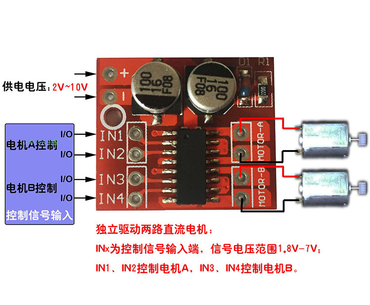 Управлял двигателями с двойным дорожным мостом, которые могут одновременно управлять двумя двигателями постоянного тока или один шаг за 4-литровый пошаговый двигатель; напряжение питания модуля составляет 2 В-10 В;
