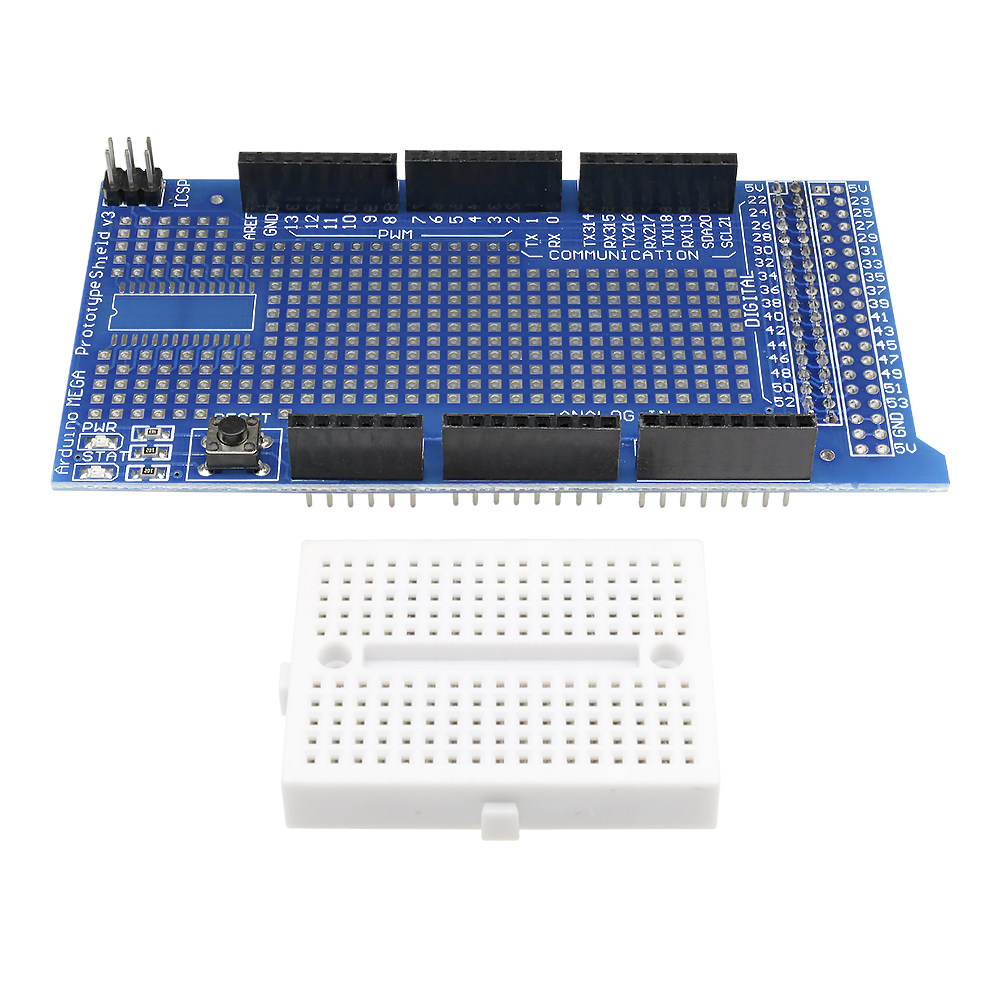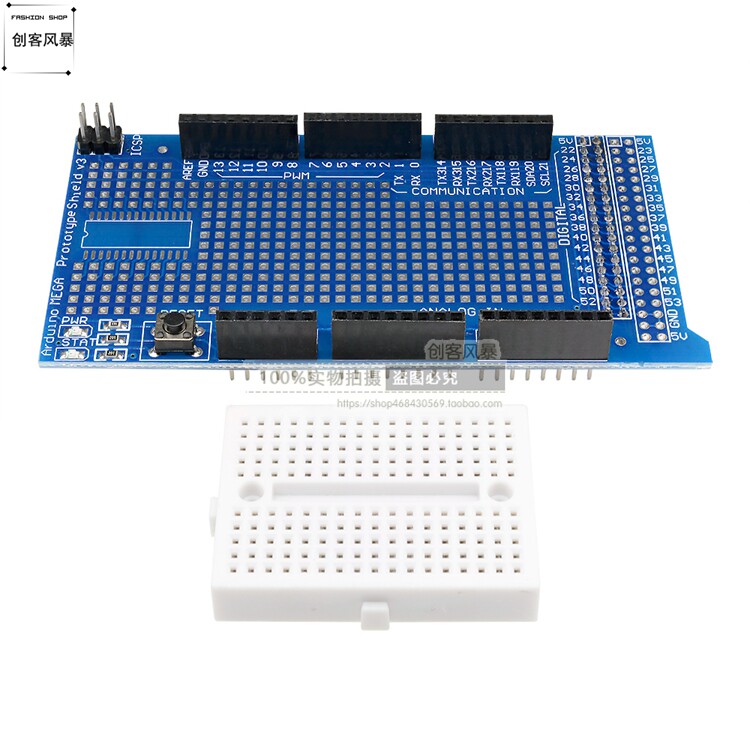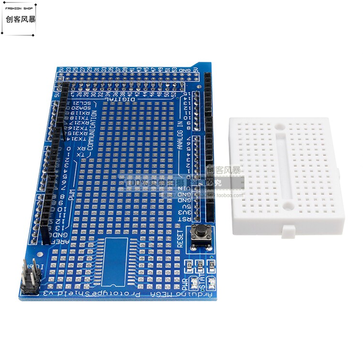 MEGA ProtoShield V3 Плата расширения прототипа обработана по технологии погружения печатных плат в золото. Золотистые квадратные площадки на основной плате имеют небольшой интервал, что облегчает пайку компонентов. Упаковка компонентов микросхемы SOP28 делает энтузиастов электроники более удобными и не ограничивается прямыми подключаемыми компонентами. Эту плату можно не только легко подключить к К контроллеру MEGA можно напрямую приваривать компоненты для создания различных схем прототипов. Вы также можете вставить мини-макет и выполнить различные эксперименты с цепями с помощью 7-цветных перемычек. На плате имеются индикаторы питания, индикаторы состояния и кнопки сброса, что упрощает изучение прототипа платы расширения контроллера MEGA.