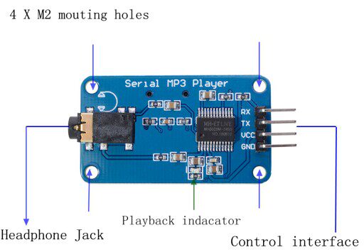 Интерфейс управления: даUART TTLинтерфейс.Там четыре контакта (GND,VCC,TX,RX) ,,,GNDЗемляVCCЭто блок питания,TXДаMP3ЧипTXБулавки,RXДаMP3ЧипRXПриколоть.