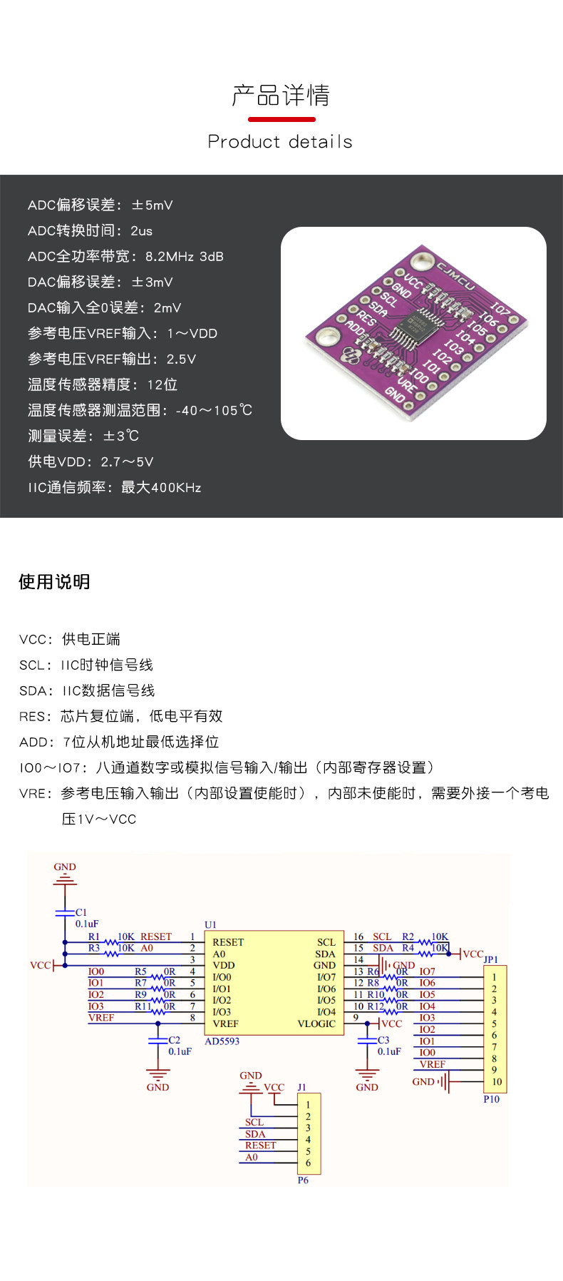 AD5593 Модуль преобразователя ADC/DAC можно настроить с помощью 12 -битного модуля преобразователя 8 каналов