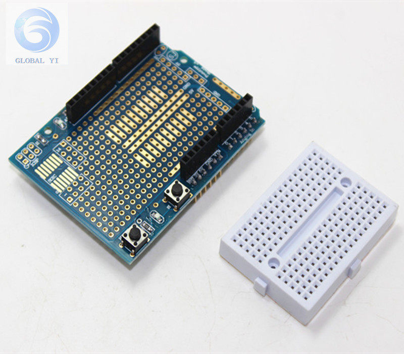 Duemilanove в сочетании с платой расширения прототипа Protoshield, используемой для создания прототипов схемы, вы можете непосредственно сваривать компоненты на плате, или вы можете подключить цепь через мини -хлебную пластину выше.Хлебная пластина и плата подключены с помощью двухстороннего клея, а хлебная пластина и плата распределены во время продажи.