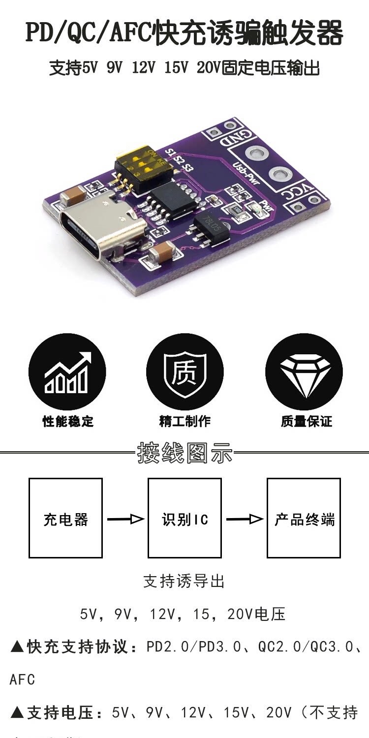 Триггер обмана быстрой зарядки PD/QC/AFC поддерживает фиксированное выходное напряжение 5 В, 9 В, 12 В, 15 В, 20 В.