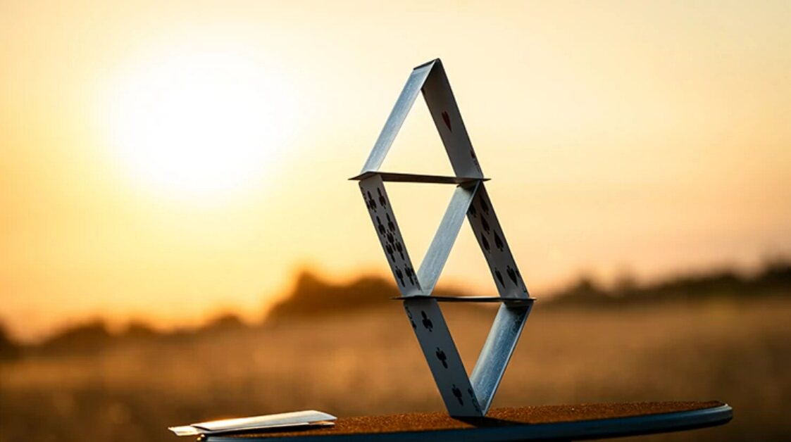 Дом карточков баланс на краю наложения крупным планом покерное покер плавающее зрение магии 2023