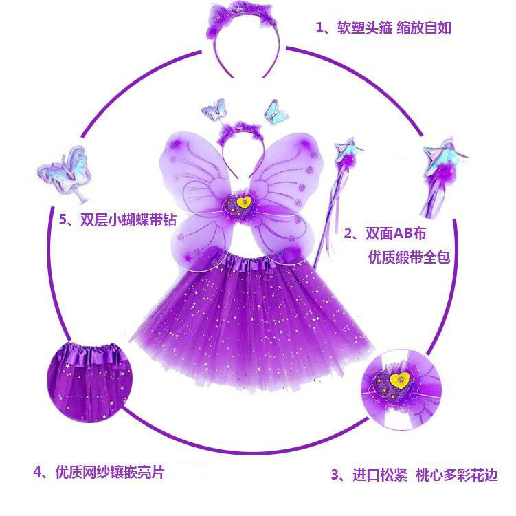 Крылья бабочки 42 *33 Длина юбки 28-30 см. Сказочная длина бейсбола 35 см звезды 7-8 см. Подходит для детей 3-10 лет!Упаковка и экспортируемые страны с толстыми пакетами OPP, такие как Европа и Соединенные Штаты, с картонной бумагой