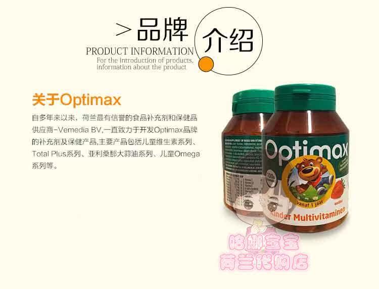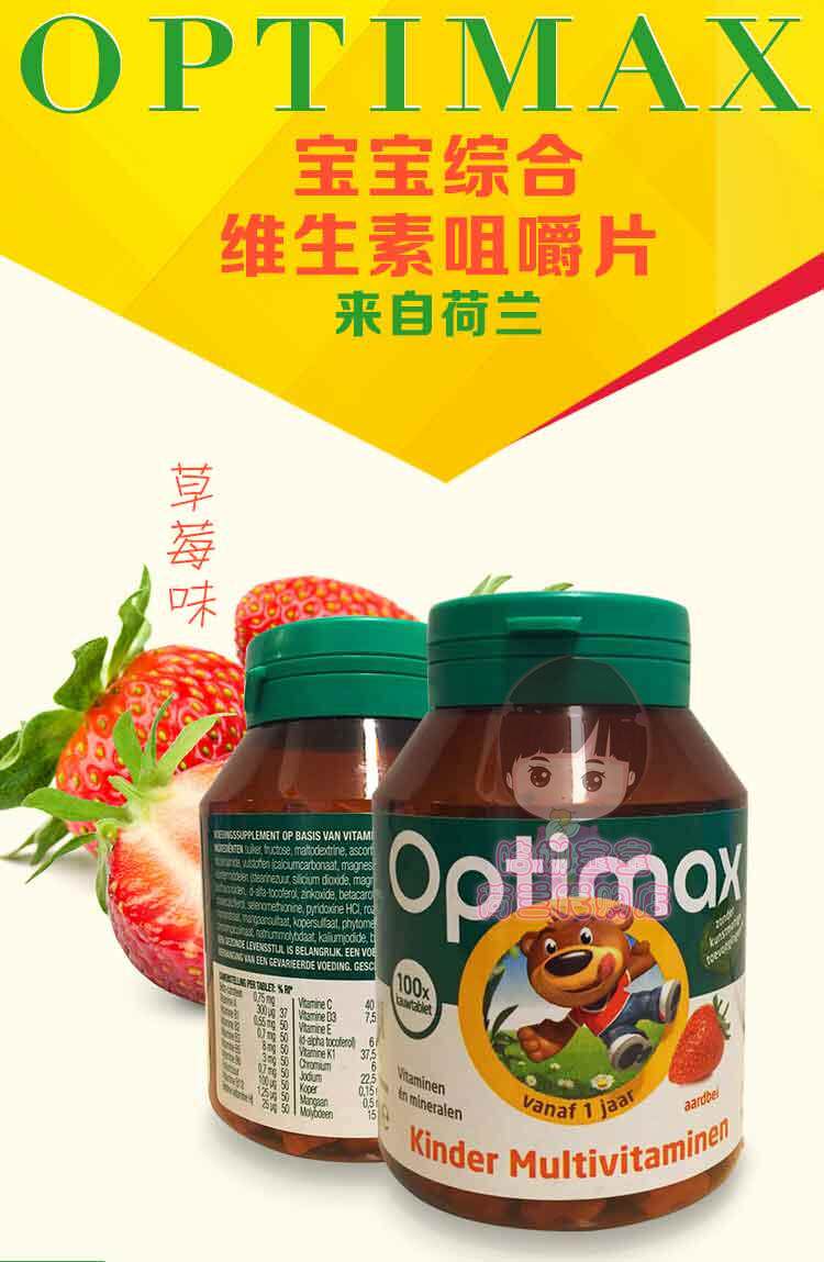 Голландские покупки Baby Optimax Многочисленные витамины жевательные таблетки клубничные аромат 1 -летний домашний тот -тот 100 капсул