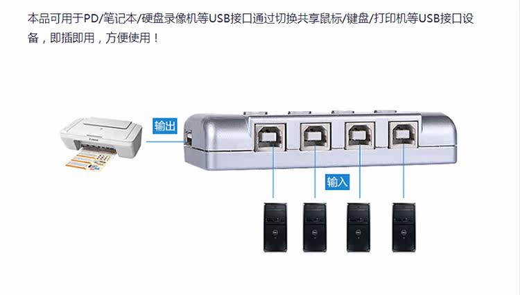 Четыре компьютера используют USB -принтер, чтобы уменьшить проблемы с подключением линий. Вы можете включить ключ, или вы можете включить клавиатуру, что удобно и быстро!Пересечение