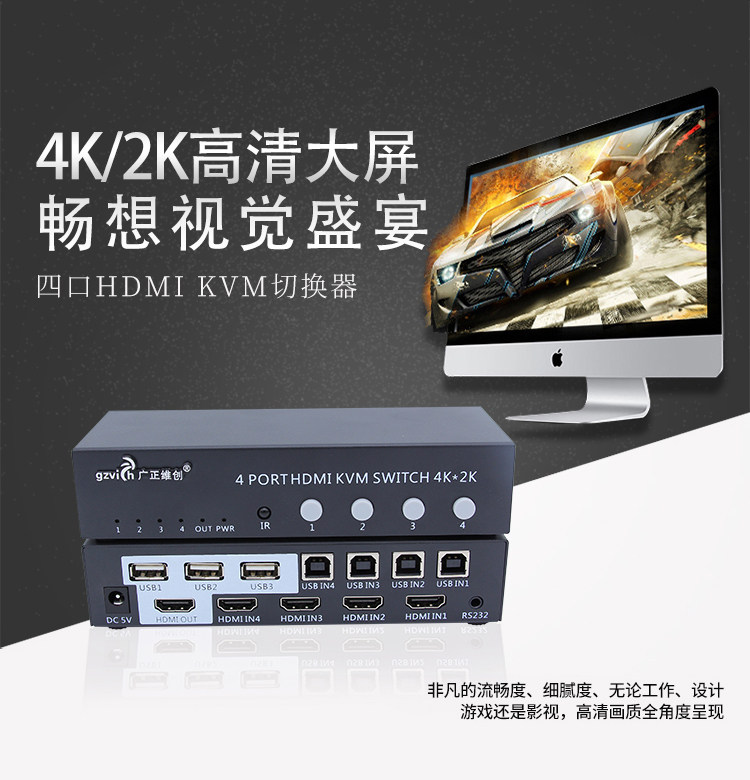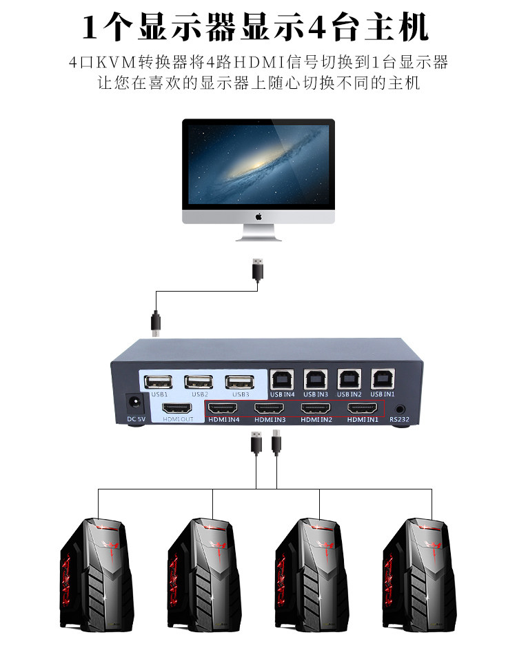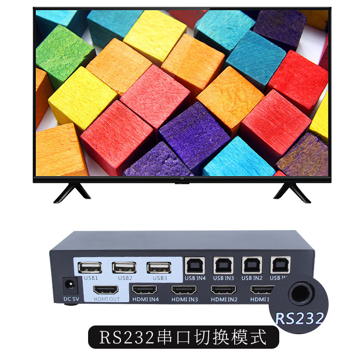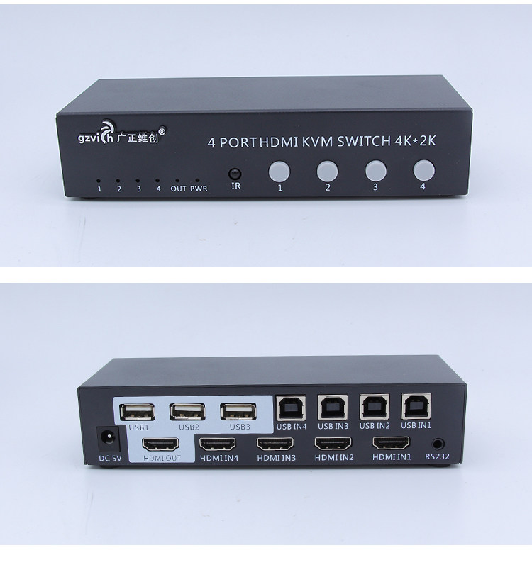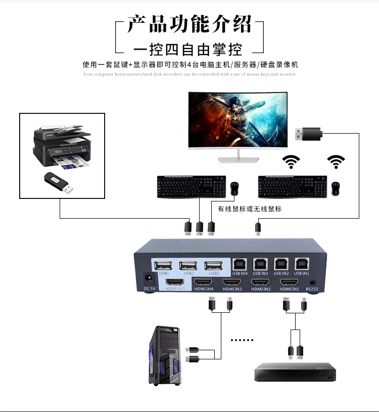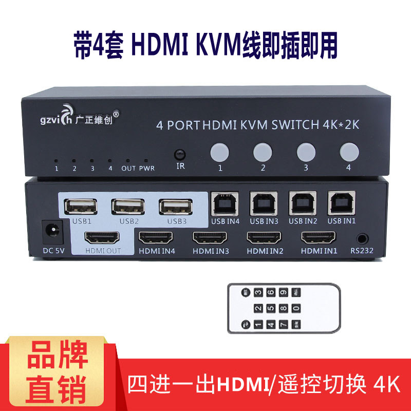 KVM-переключатель 4 порта Компьютерный хост 4 в 1 Видеорегистратор для наблюдения HDMI Четыре входа и один выход для мыши Клавиатура USB USB-устройство для совместного использования печати Разделенный экран с дистанционным управлением Управление последовательным портом 4K * 2K