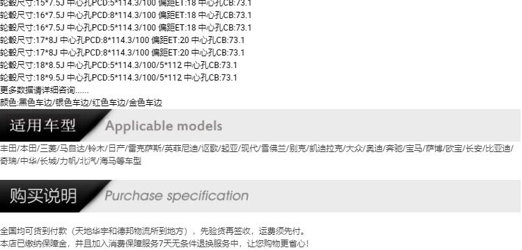 | Размер колеса: | 13x6J, 14x6.5J, 15x7.5J, 16x7.5J, 16x7J, 16x8.5J, 17x8J, 18X8.5J, 18X8J, 18x9.5J |