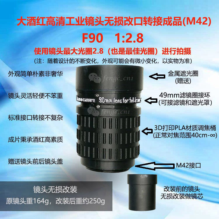Камера объектива:Задний порт представляет собой интерфейс резьбы M42, а переносительное кольцо M42 на собственный интерфейс камеры предусмотрено для трансферного кольца для обычного использования обычно