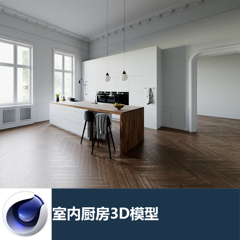 C4D MAX FBX OBJ Внутренняя сцена открытая кухонная столовая ресторан с картой трехмерной модели_1035