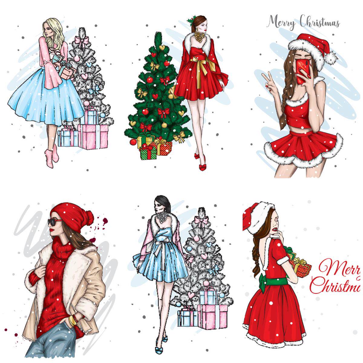 K641 Рождество счастливая юбка для моды девушка модная шляпа красная зимняя иллюстрация рисование вектор ай материал
