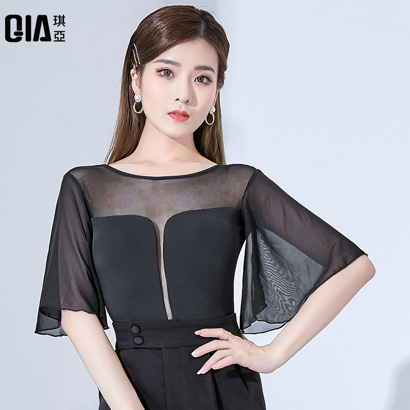 Kia Streamer Latin Dance Top для женщин сексуальная тренировочная одежда круглая шея Slim Waltz Современная танцевальная одежда