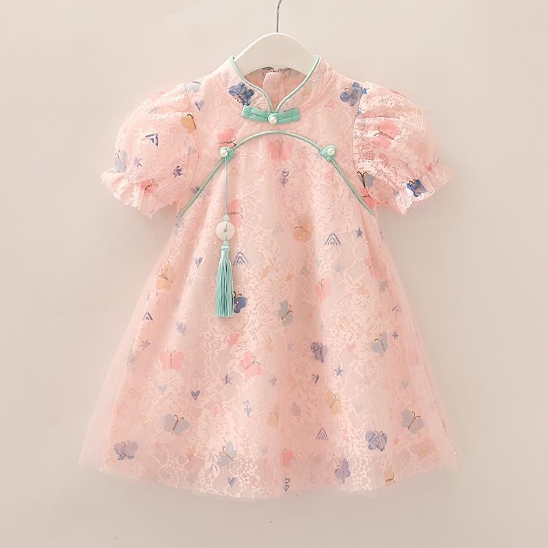 Летнее ципао, ретро кружевная юбка на девочку для принцессы, 2023, короткий рукав, китайский стиль