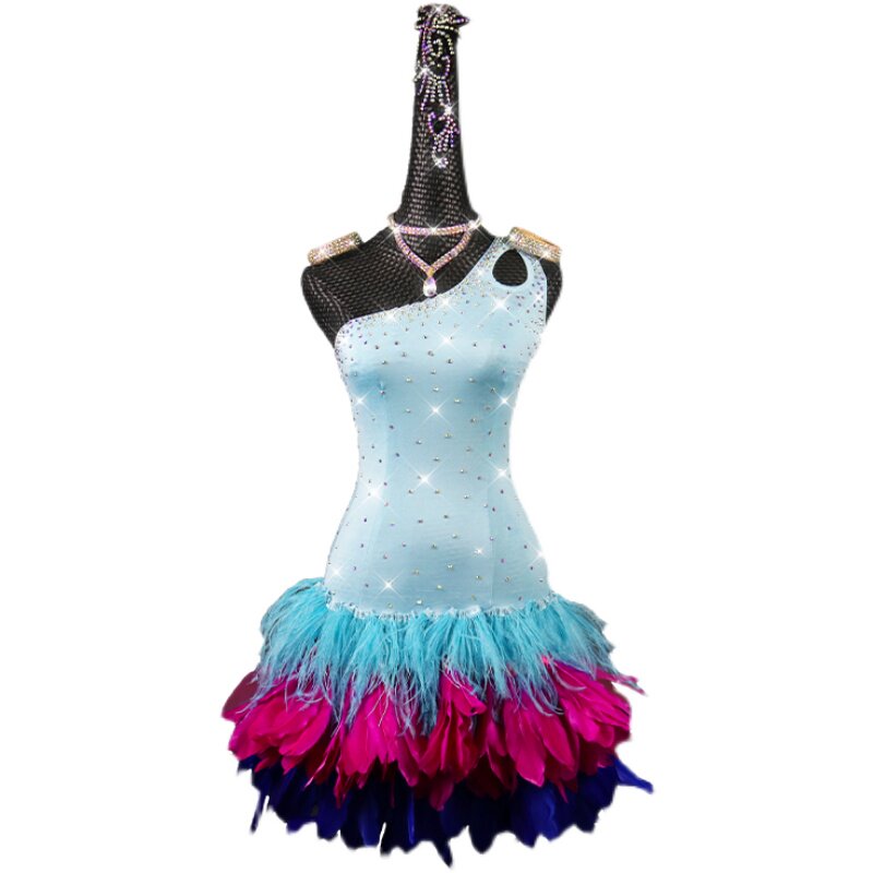 Детское синее элитное платье для танцевального шоу, 2023, набивка пером