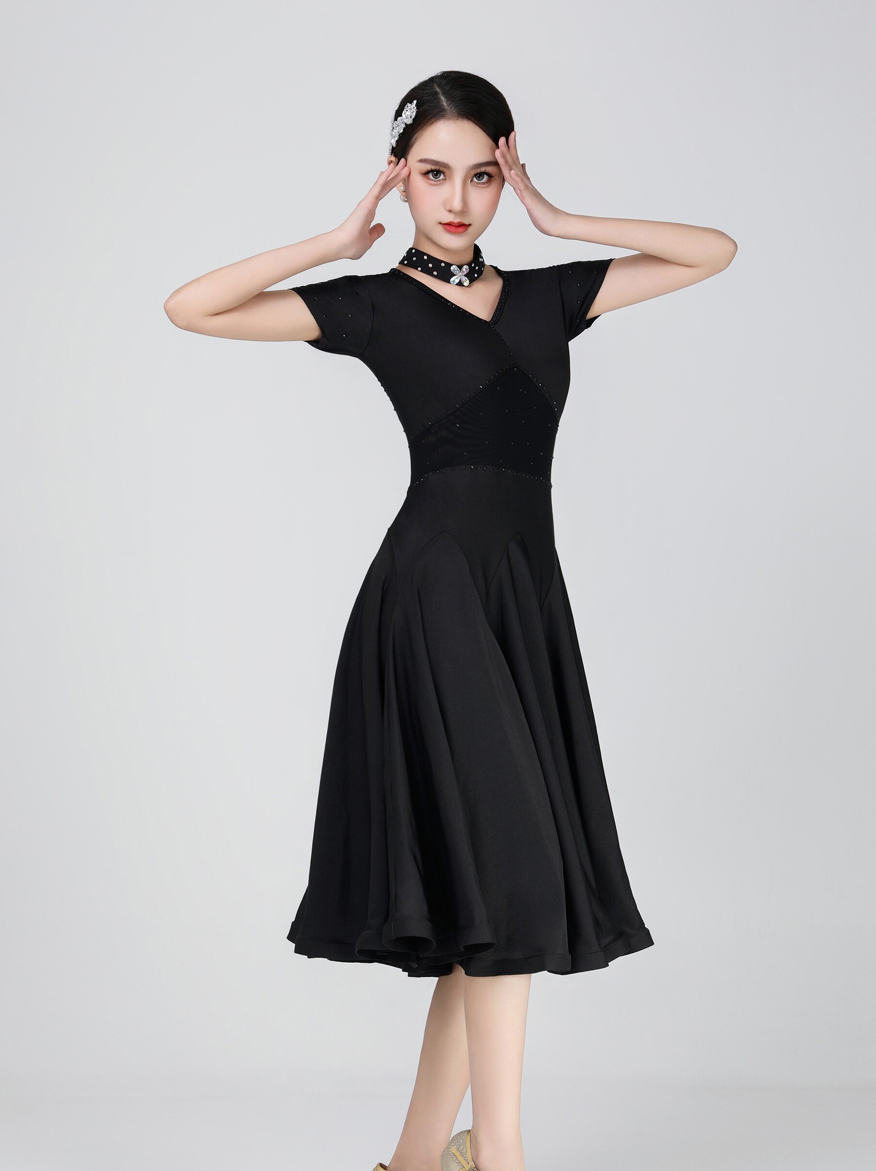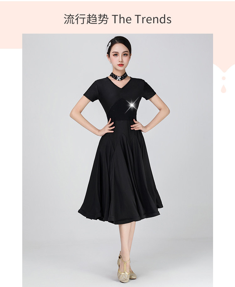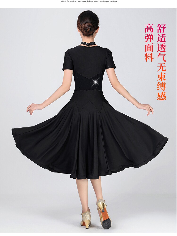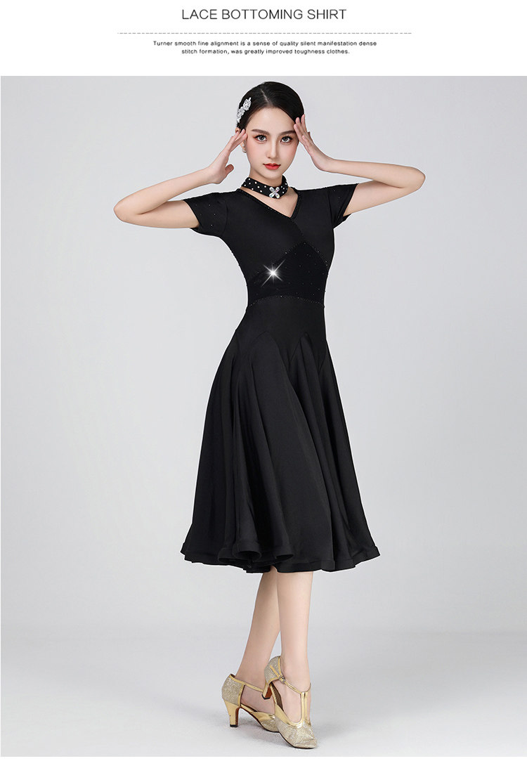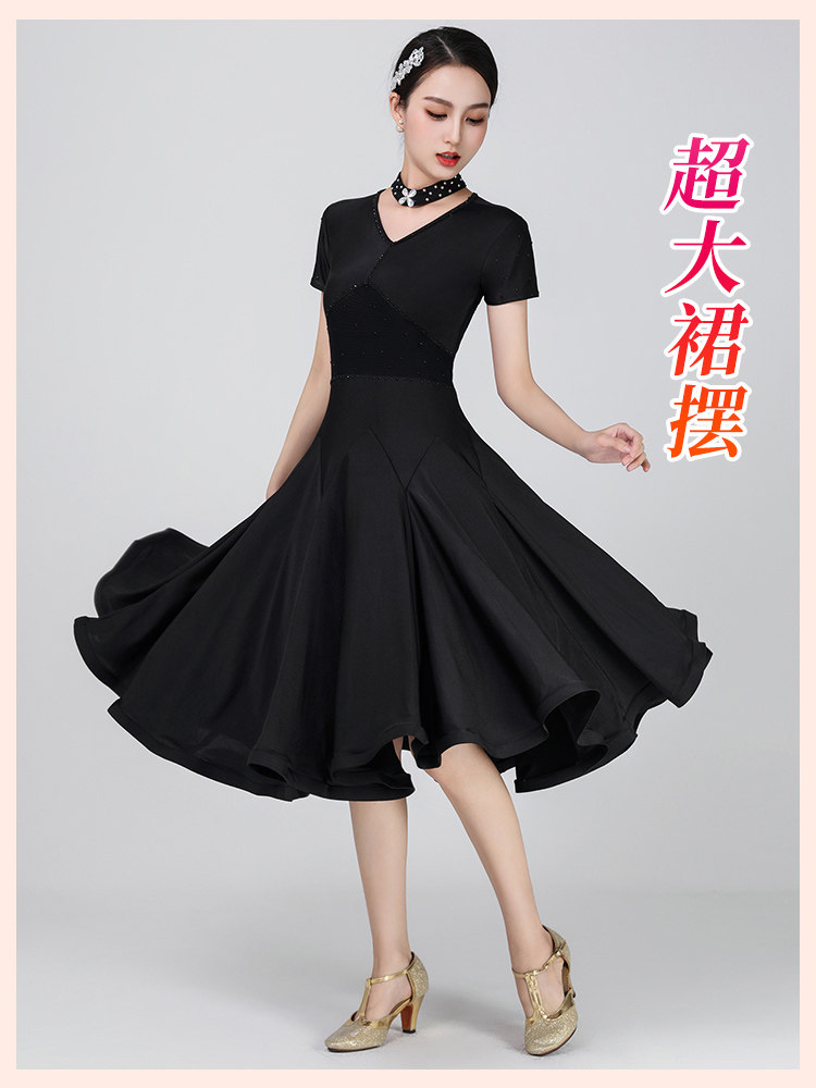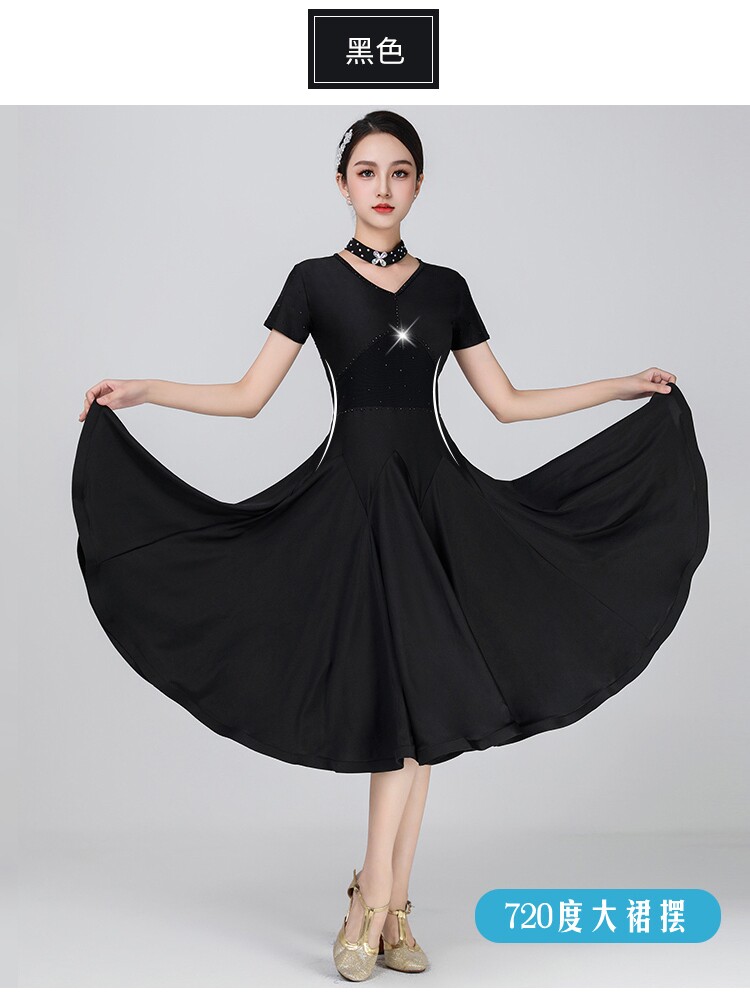 Платье, цветной костюм, дышащая черная длинная юбка, короткий рукав, V-образный вырез, по фигуре