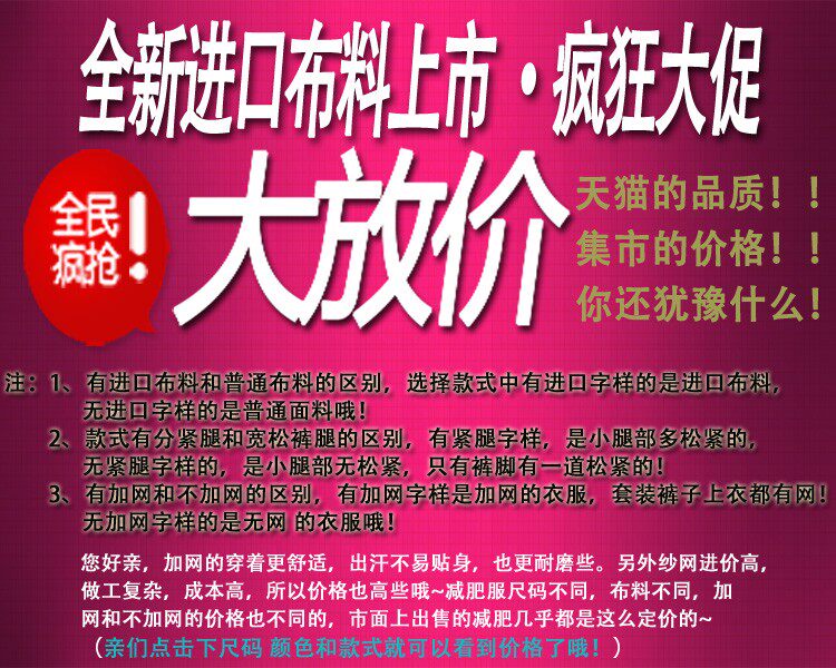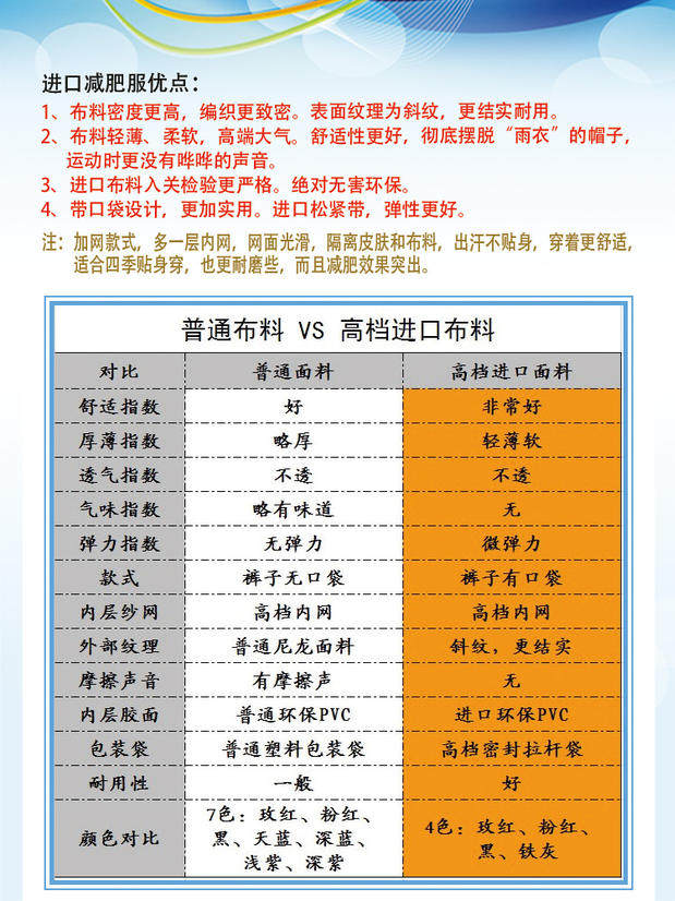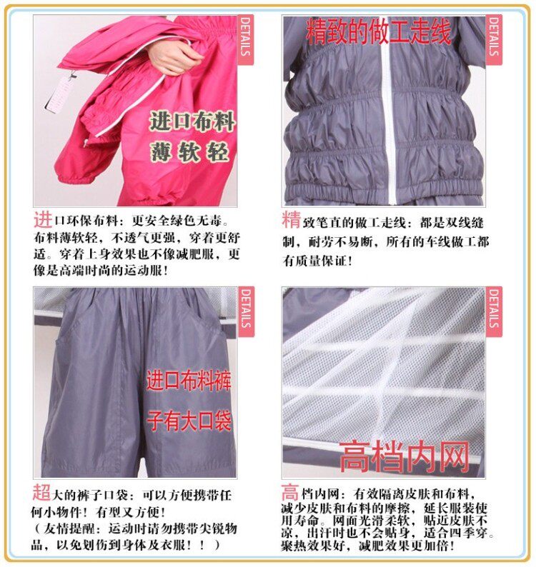 Внешний слой материала одежды - это дождевой шелк, а внутренний слой используетсяPVCпокрытие. Ткань прошла защитную обработку, обезжиривание и полировку. Цена дороже обычных тканей на рынке.20%СущностьТаким образом, одежда имеет хорошего качества, высокого комфорта, хорошего эффекта потоотделения и подходит для производства, чтобы похудеть.Если вы надеваете нашу одежду во время фитнеса, вы несколько раз будете увеличить мобилизацию жира в организме, что значительно будет способствовать разложению и метаболизму жирных кислот в организме и сыграет роль в помощи похудения.