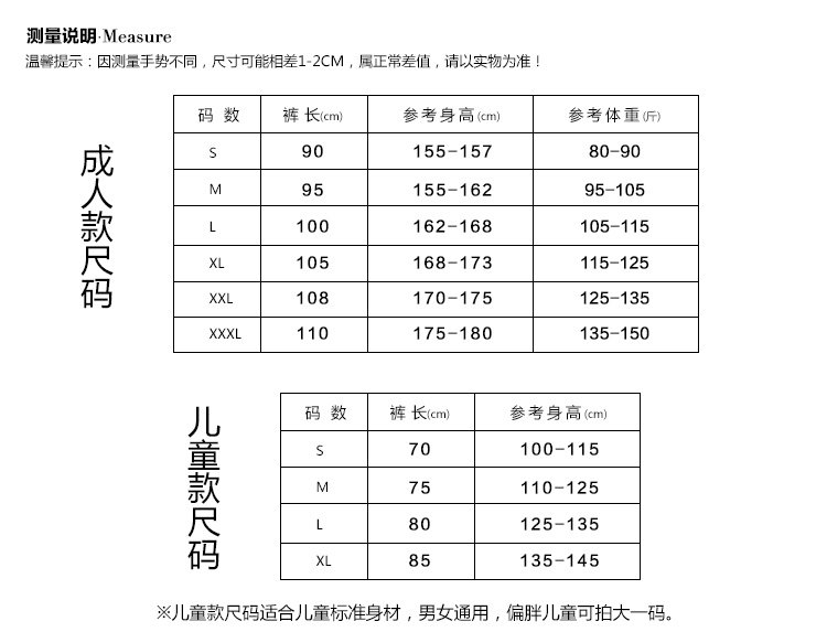 Детская модель L Размер: высота 125-135 см (длина брюк около 80 см)Детская модель XL Размер: высота 135-145 см (длина брюк около 85 см)