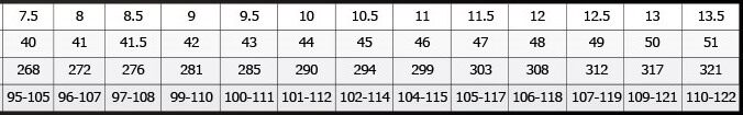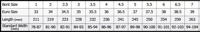 Таблица сравнения кода обуви Bont: