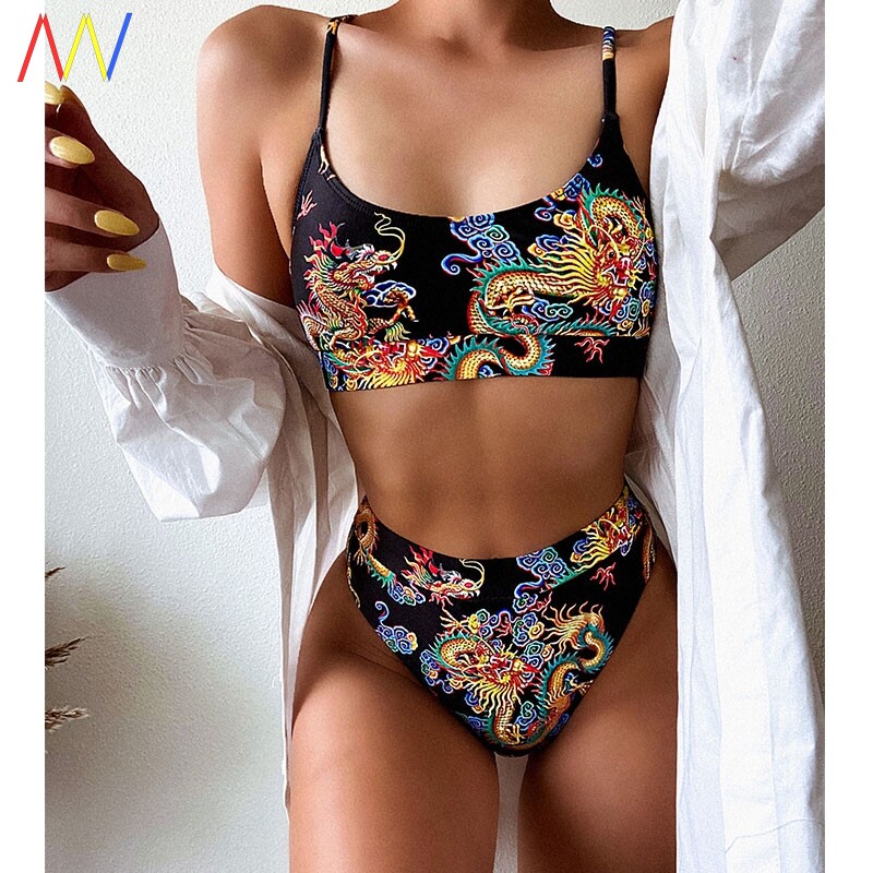 Бандо высокая талия бикини отжимание купальники We 2020 Dragon Pranted Sexy Bikini Set Retro Swimsuit женский купальный костюм