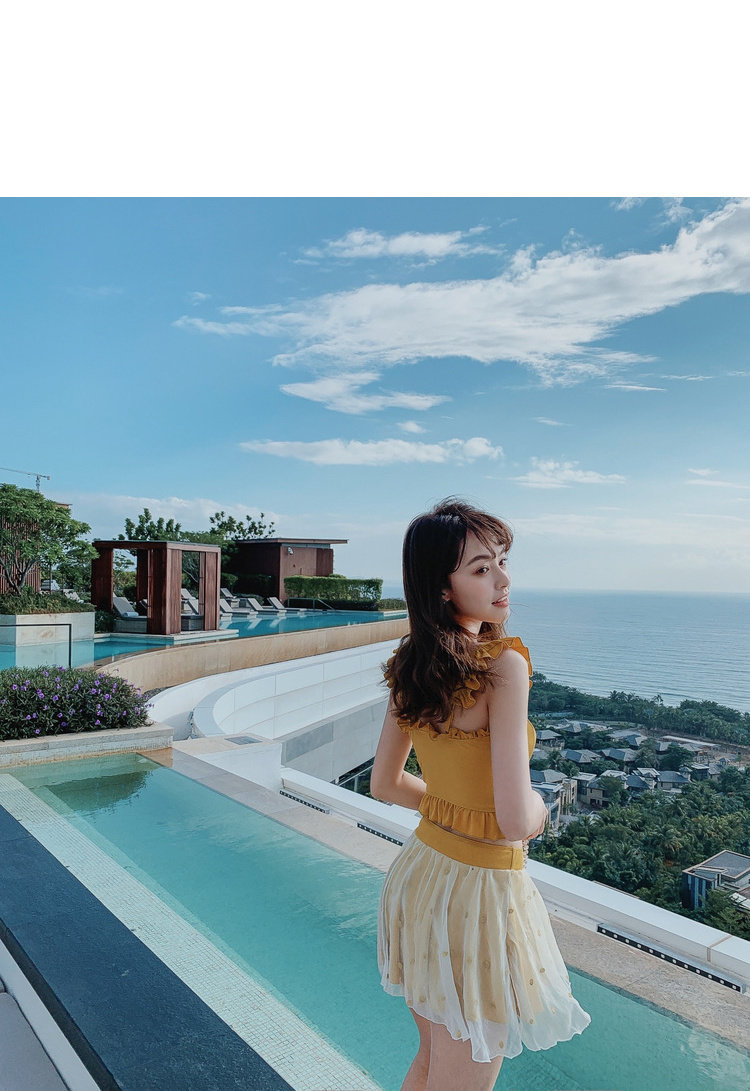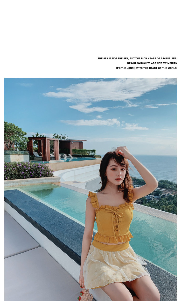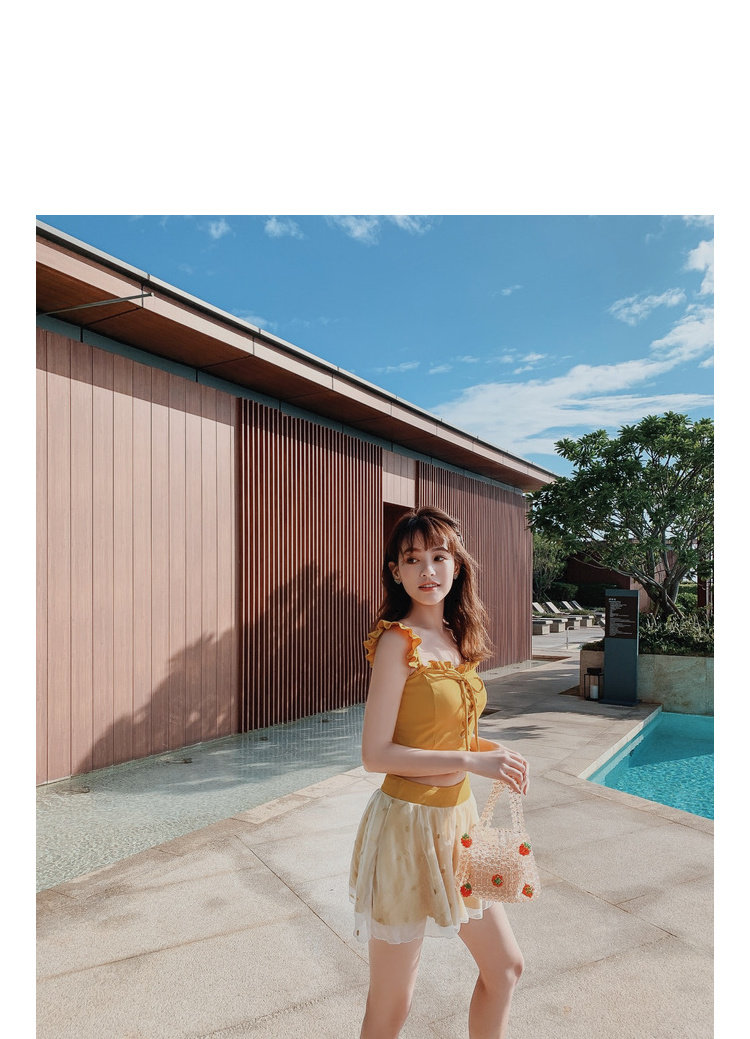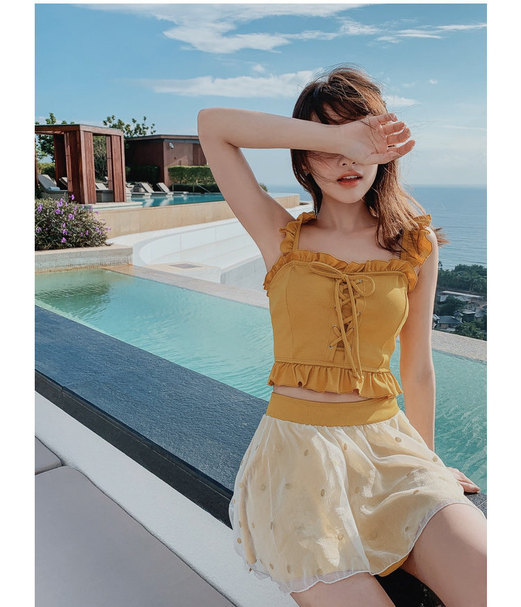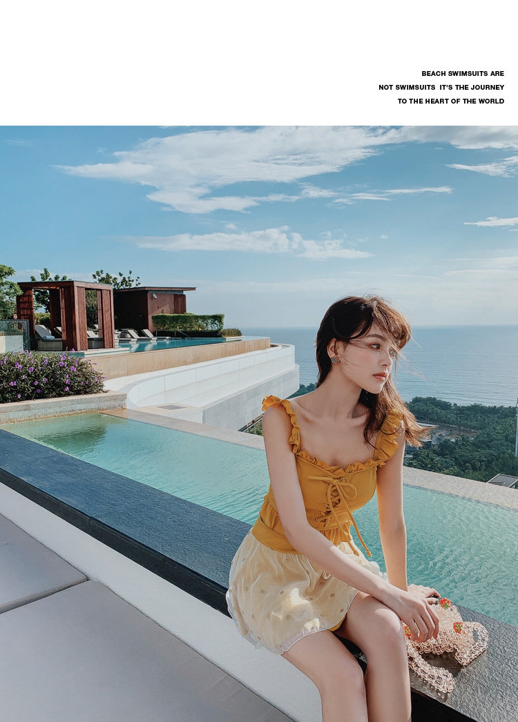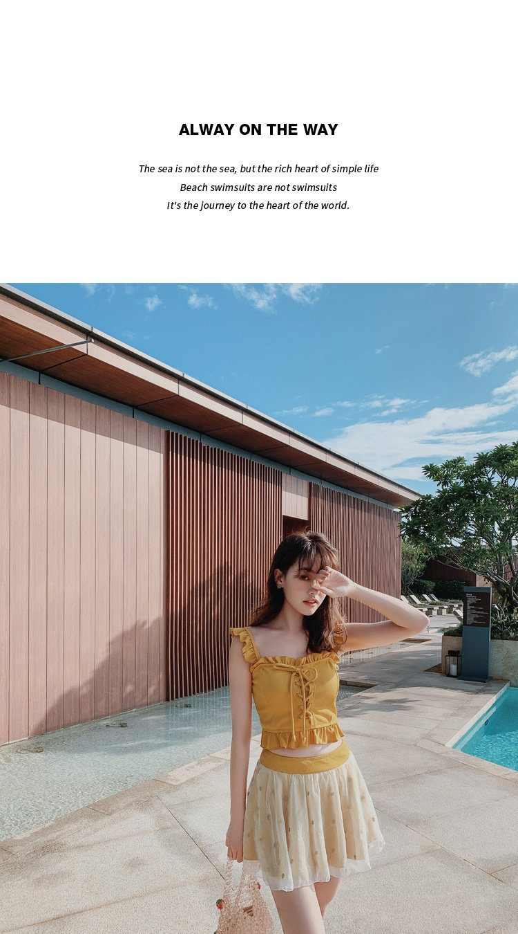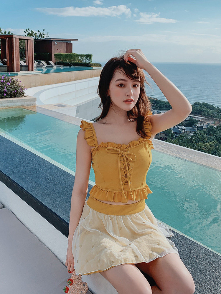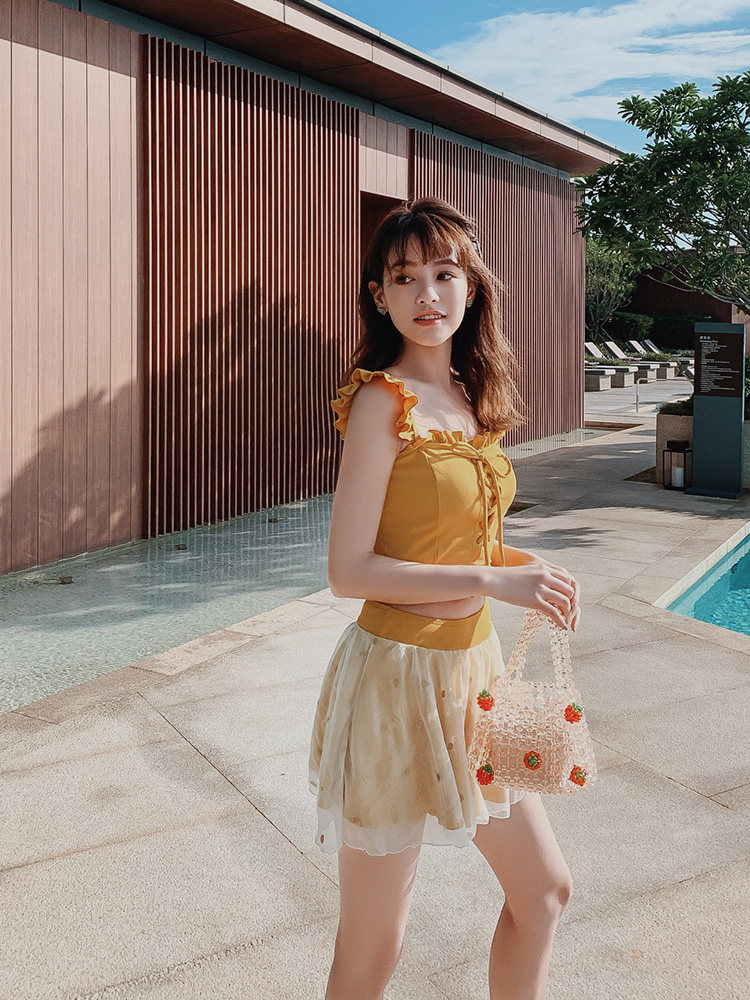 "Теплый купальник желтого цвета с простым и незамысловатым дизайном.Делает кожу более белой и блестящейДобавлен блеск линиям телаНе делайте гостей и делайте красоту женских кривых более заметнымиДизайн топа на бретельках и бежевой юбкиПозвольте вам стать красивым пейзажем у моря"