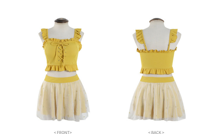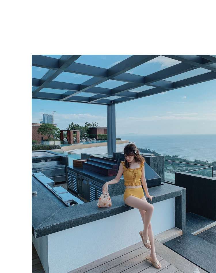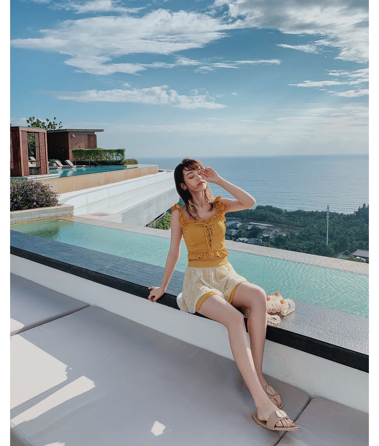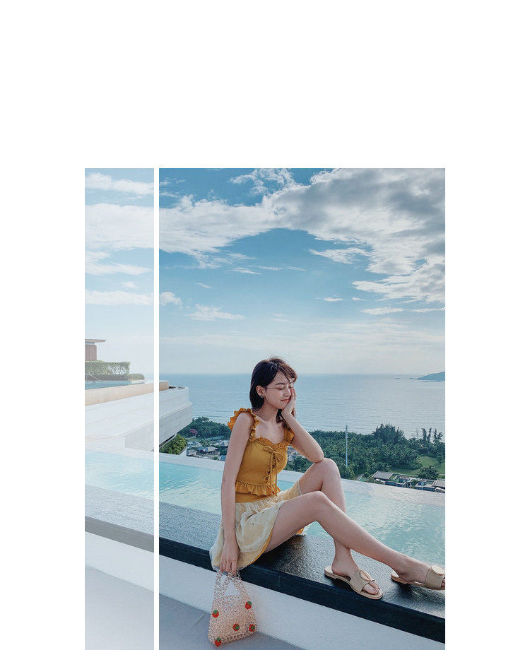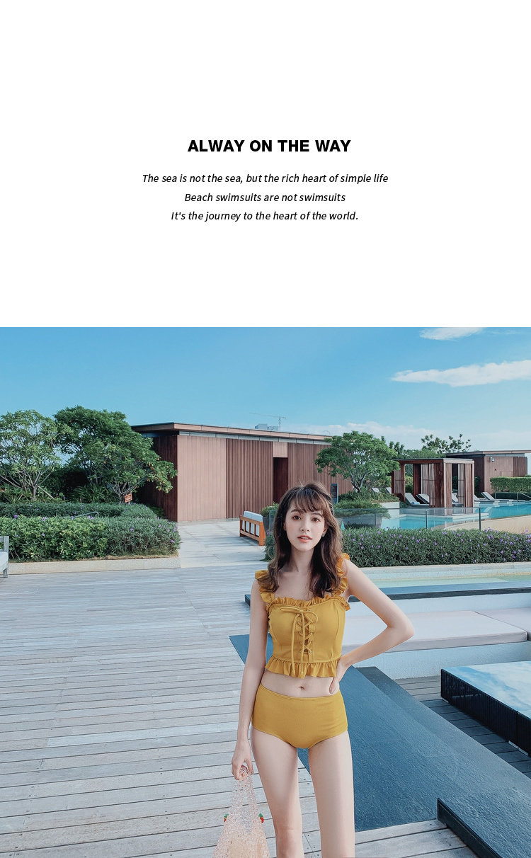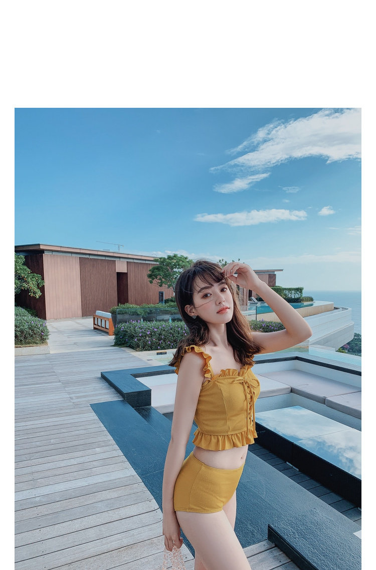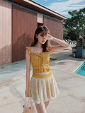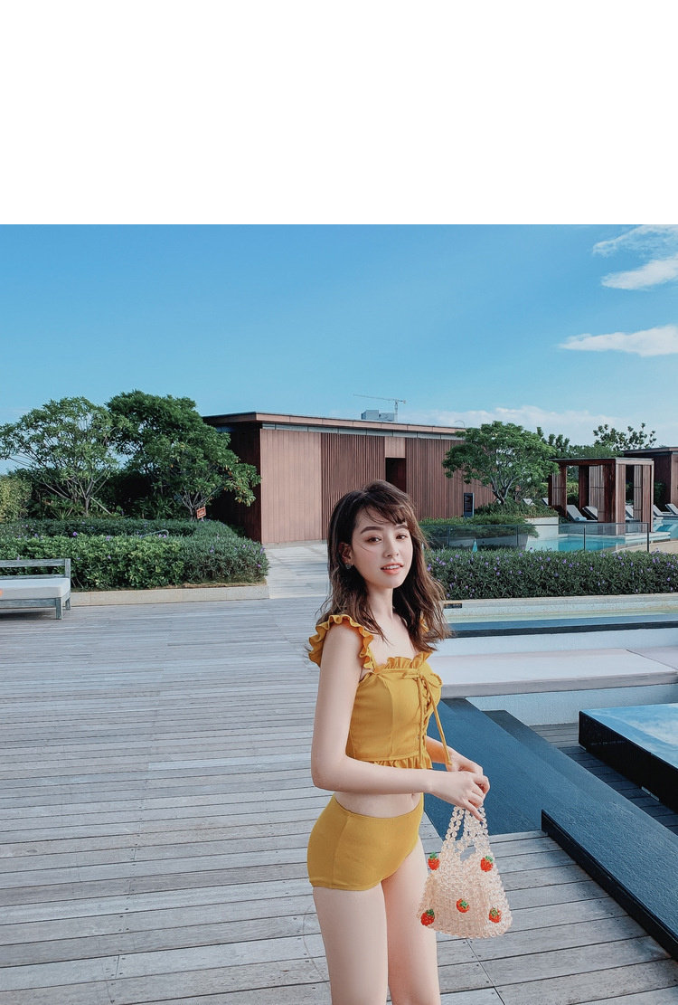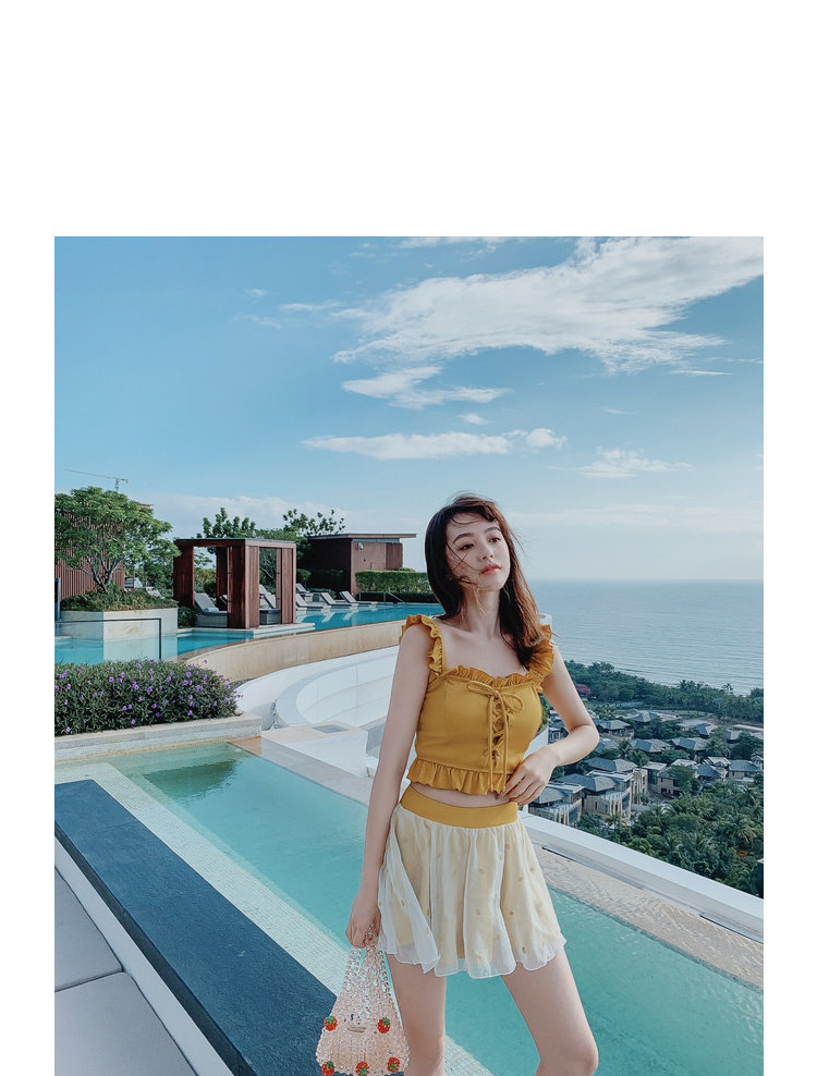 "Теплый купальник желтого цвета с простым и незамысловатым дизайном.Делает кожу более белой и блестящейДобавлен блеск линиям телаНе делайте гостей и делайте красоту женских кривых более заметнымиДизайн топа на бретельках и бежевой юбкиПозвольте вам стать красивым пейзажем у моря"