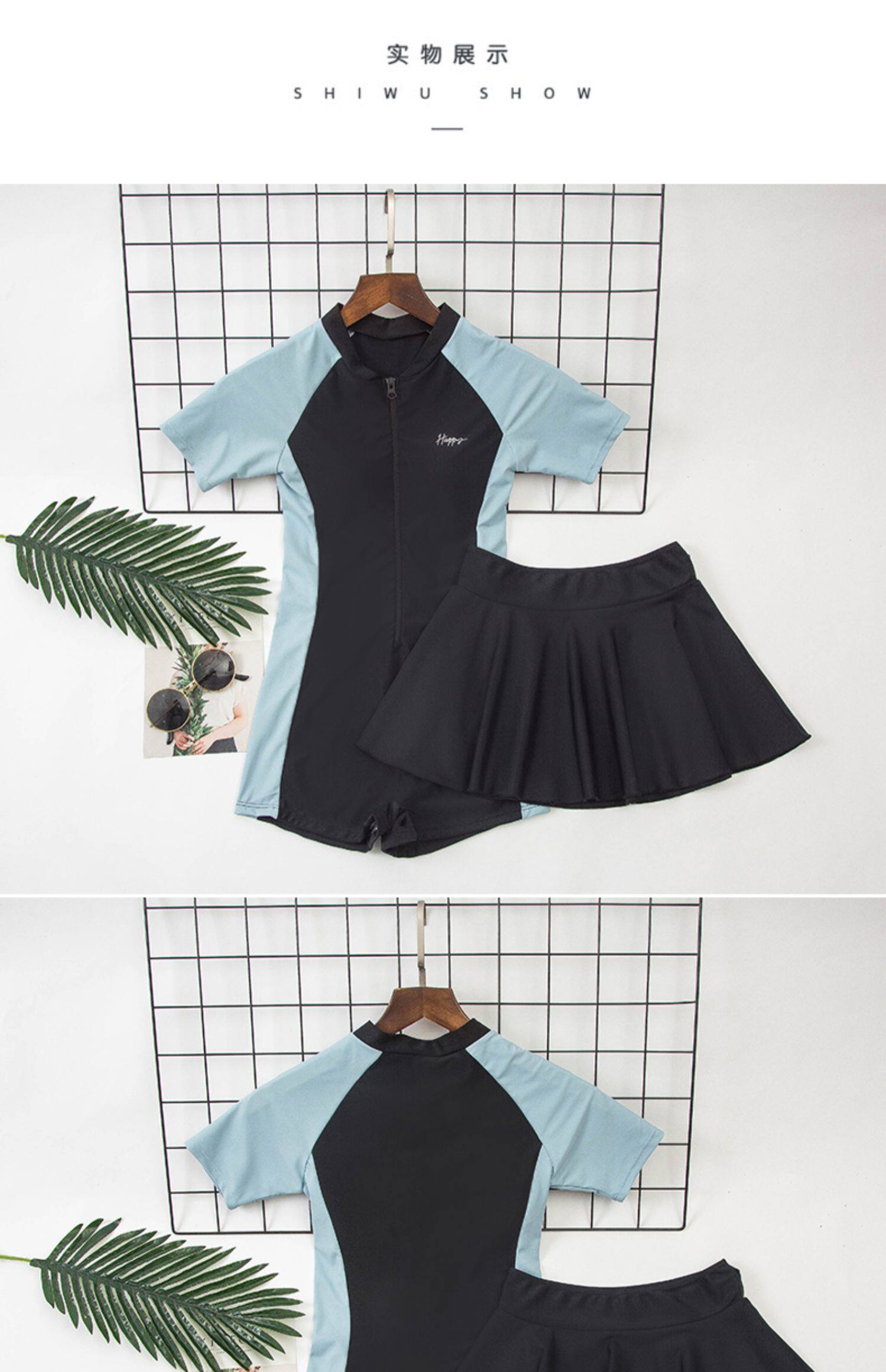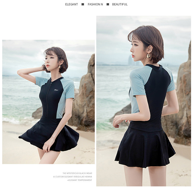 - Синий черный короткий рукав [Юбка с разборкой]+плавательная шляпа