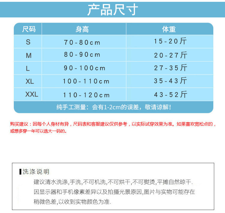 | Размер: | S [рекомендуемая высота 70-80 см], М【Рекомендуемая высота 80-90см】, L【Рекомендуемая высота 90-100см】, XL [рекомендуемая высота 100-110 см], 2XL [рекомендуемая высота 110-120 см], 3XL [рекомендуемая высота 120-130 см] |