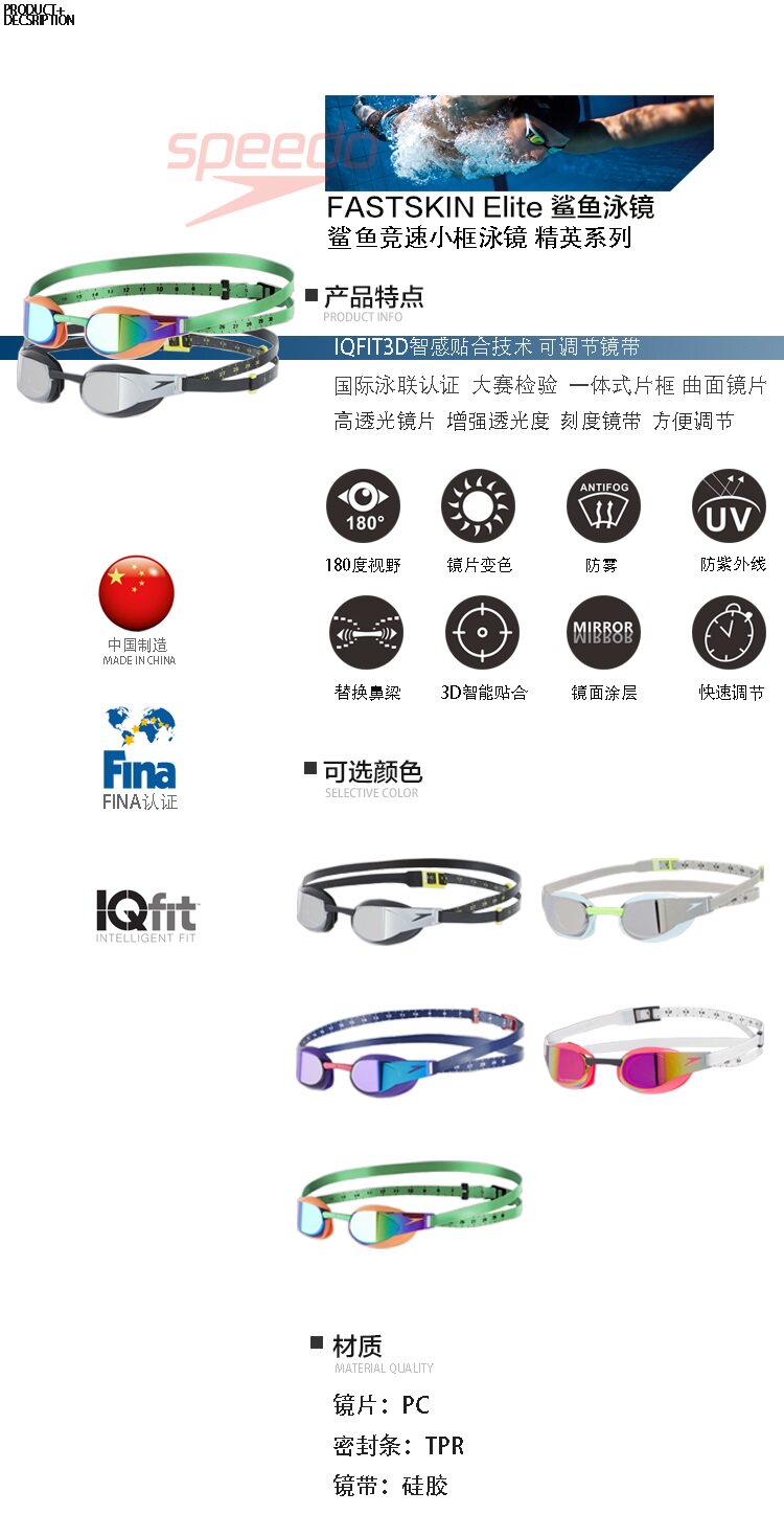 Speedo Spear Fastskin3 плавание зеркальное рама рама анти -ффо -гонки Профессиональные покрытия акулы Пан Чжанл