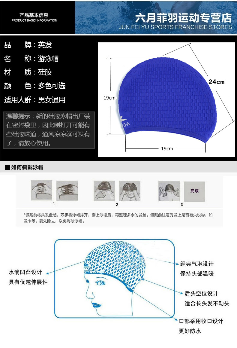 英发 Водонепроницаемая нескользящая силиконовая плавательная шапочка в форме капли, водонепроницаемые эластичные комфортные гидрогелевые шарики подходит для мужчин и женщин для плавания