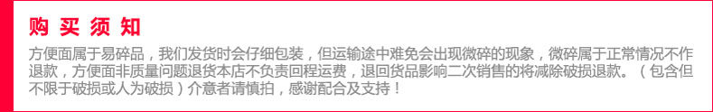 2:方便面为易碎易压品,寄快递路上颠簸,可能会导致箱子盒子变形,但不会影响食品本身的味道和口感,介意的亲慎拍哦!