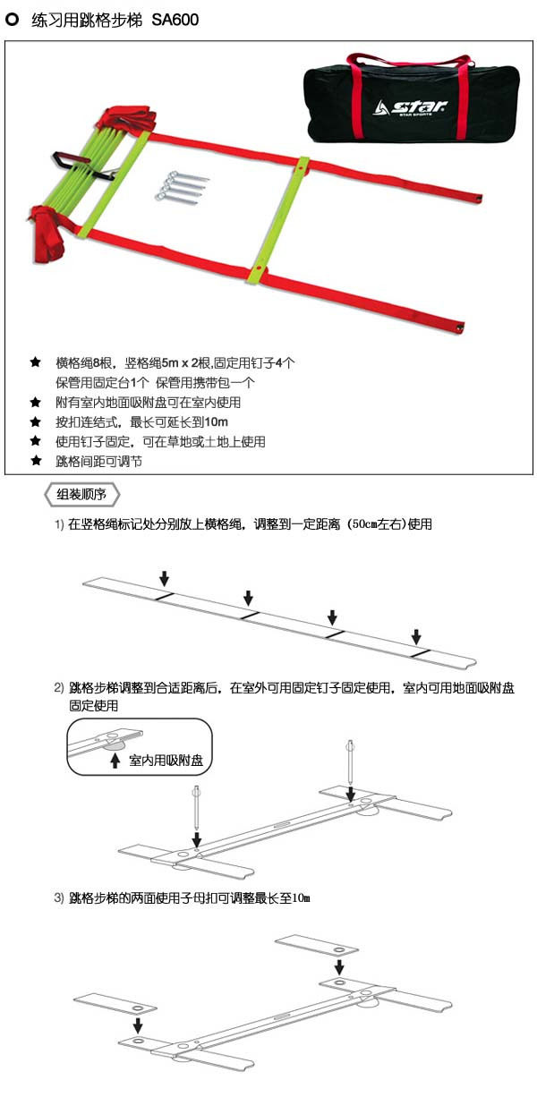 Имя: лестница прыжков Модель: SA600 Цвет: оранжевый/желтый Материал: пластик Место происхождения: Тайвань Спецификация: 5 м*ширина 0,46 см 8 сетка Упаковка: сумка (показана на рисунке) Особенности: Может быть фиксированным помещением и на открытом воздухе, используется для тренировок Нажмите тип соединения пряжки (длина может быть расширена) Расстояние расстояния на расстояние Используйте ногти, которые будут фиксироваться, могут использоваться на траве или земле Согласно пряжке, наибольшая завод может быть продлен до 10 метров