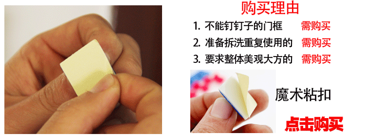 важное напоминание:Пожалуйста, протрите дверную раму чисто, прежде чем использовать, найдите хорошее положение и одновременно прикрепите ее, в противном случае это повлияет на липкость магической пряжки.