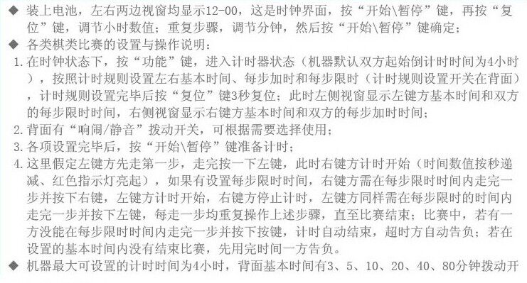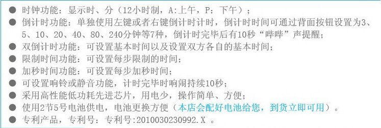 ○ Функция напоминания о тревоге:настраиватьЗамок и немойУдобный, большой объем, шум длится 10 секунд в конце игры.Состояние дисплея в конце игры поддерживается, нажмите“Восстановление&Rdquo; ключ на 3 секунды, чтобы сбросить, вернемся к времени до начала игры.