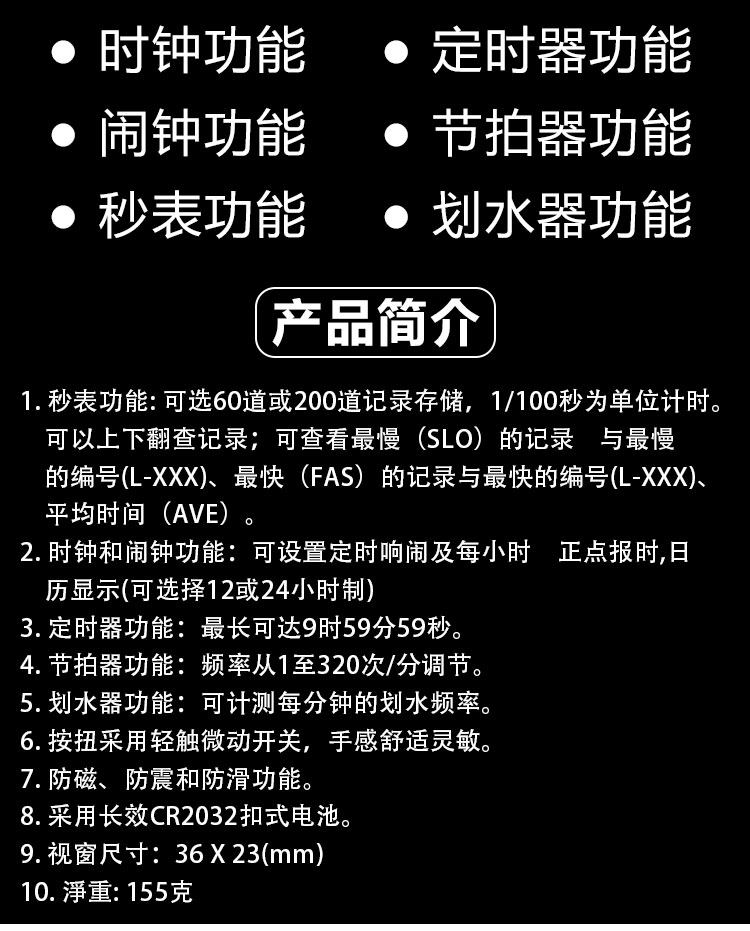 1..Запишите время: в случае отображения таймера нажмите кнопку режима, чтобы выбрать, и может появиться функция секунды.Нажмите кнопку «Пуск/остановка», чтобы запустить автоматические секунды, а затем нажмите остановку второго, чтобы показать рассчитанные данные.Нажмите клавишу LAP/RESET и автоматически возобновите ноль.