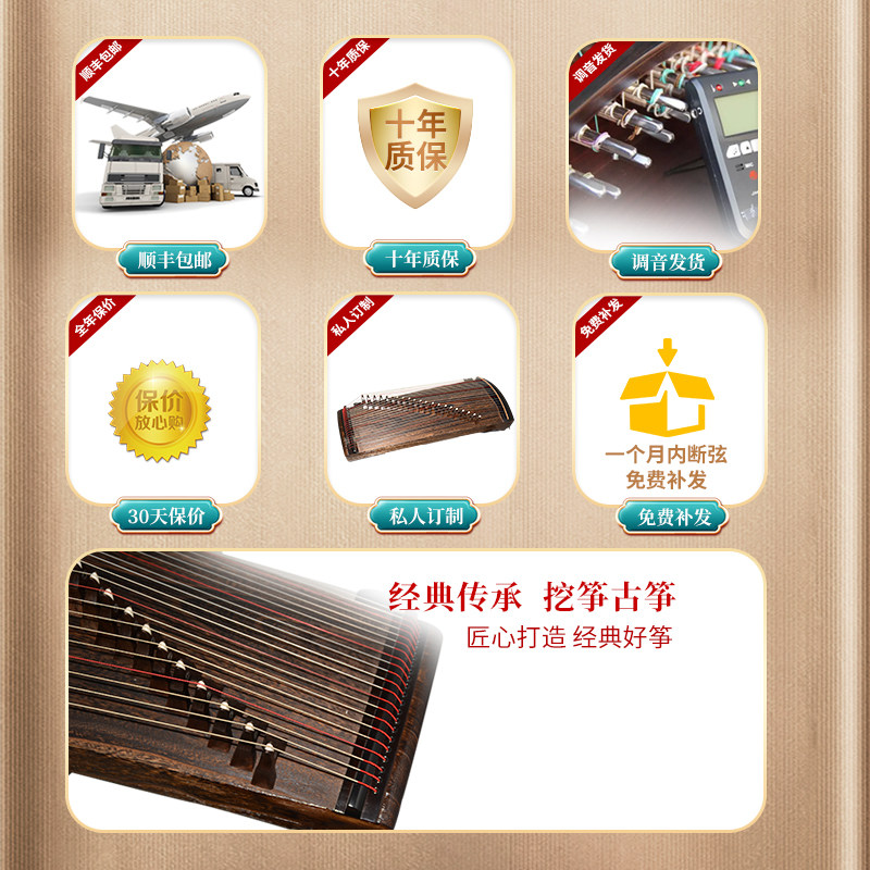 Аксессуары: один настройка гаечного газа, одна специальная сумка для фортепиано, одно руководство по руководству, 2 гвозди(8 штук), комплект струн (установлены), комплект подставок, пара кронштейнов гучжэн А-типа, запасные струны №1-5 и сравнительная схема размещения подставок.