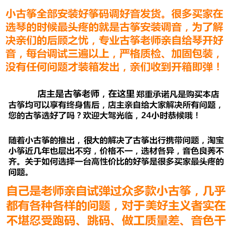 Эта цитара невелика по размеру, легким весам, хорошим звуку и удобному струнко 50%обычно обычно. Так что это называется Banzheng.Поскольку длина составляет только половину обычной цитеры, конструкция длины струн полностью расширяет его длину, чтобы достичь предела корпуса пианино.Дизайн скрипки резонансной коробки преследует максимальное эффективное пространство резонанса, и негативные последствия объема тона тона решаются посредством вышеуказанных мер.Сила тонкого пианина Zizheng является эффектом звука половины цигиры, столько же удовлетворительного.Запуск Banzheng обеспечивает отличное удобство и легко носить с собой ученикам, которые путешествуют, путешествуют и живут в школе. Они могут практиковать пианино без фортепиано.