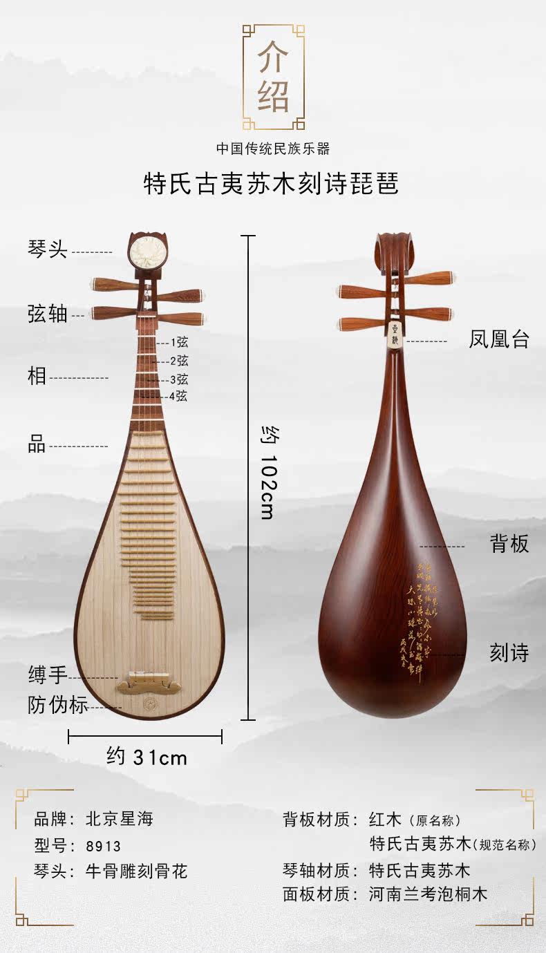 Пекин Синхай 8913 Терри Гайи Су му Мангвума резные стихи Поэмы Чистый лес Осевой пипа музыкальный инструмент для взрослых упаковочных аксессуаров