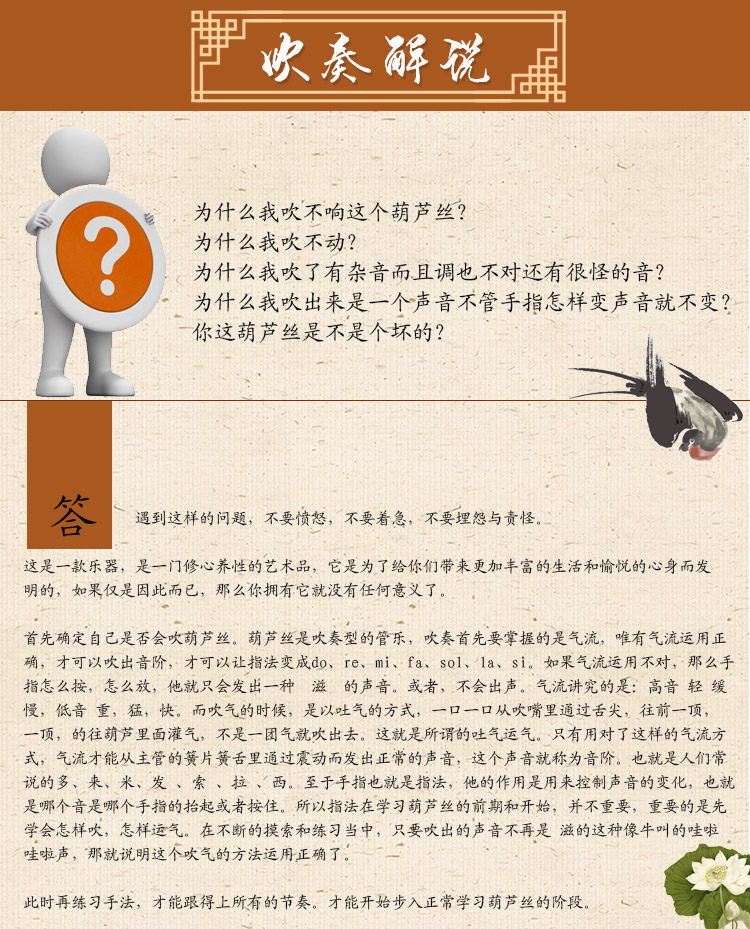Особенно новички, которые только что получили тыквы, также обращают на это особое внимание. Согласно методу и требованиям производительности производительности, используйте дыхание, чтобы правильно играть, иначе это повлияет на звук инструмента и даже взорвать тыква шелковой тростник.