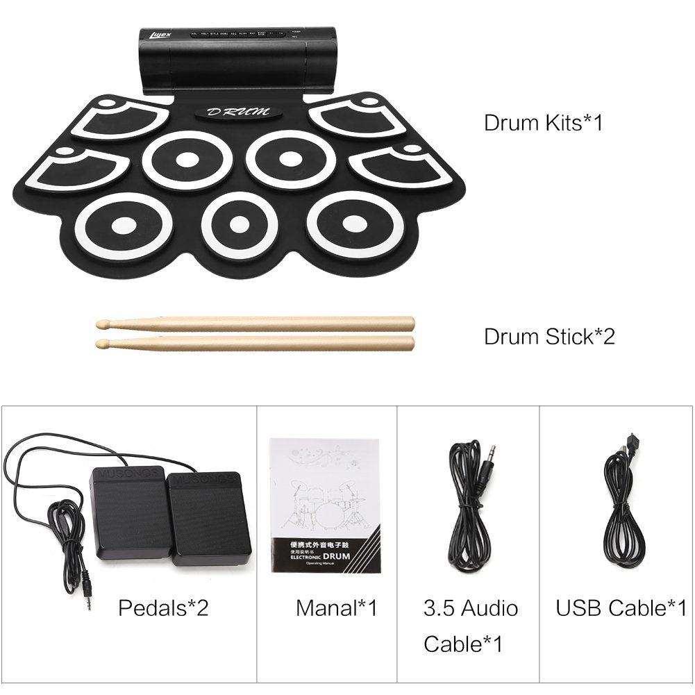 5. Идите с электронными барабанами, барабанными палочками, двумя педалями, USB -кабелем, 3,5 аудио -кабелем.
