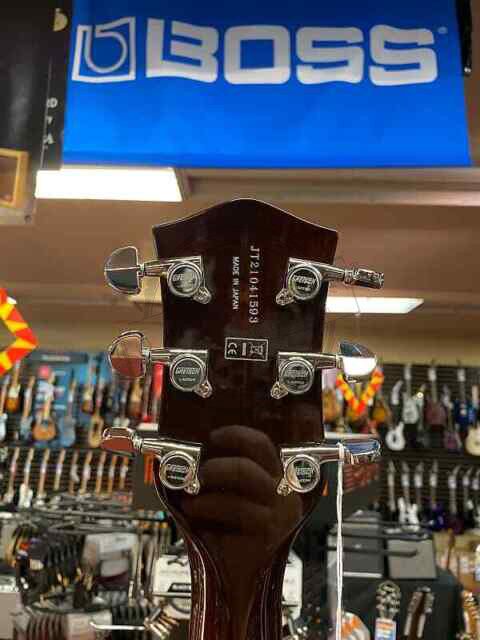Накладка грифа из черного эбена имеет классическую вставку в форме миниатюры, традиционную раскладку органов управления, популярный стиль, оснащенный тремоло Bigsby!