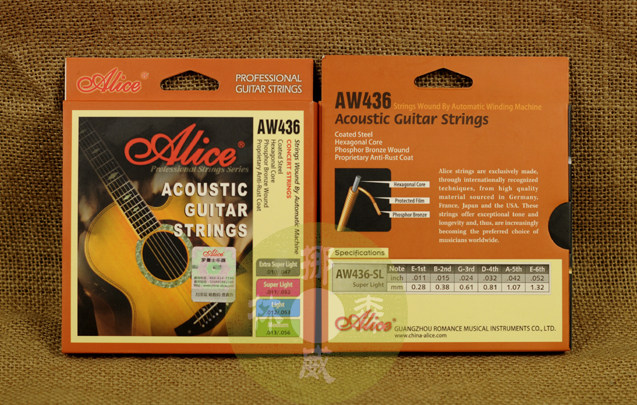 Алиса AW436 Народная гитарная серия, существует четыре различных строки напряжения 010, 011, 012 и 013, подходящие для различных потребностей в производительности. Строковые отдельные строки используются в качестве запасной строки.